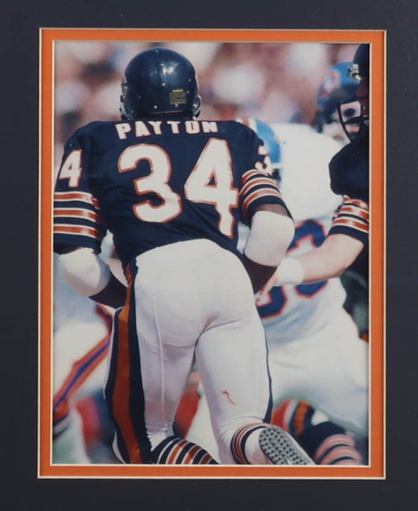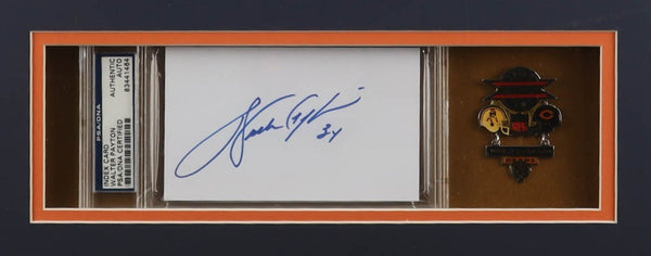 Custom framed display measures approximately 32" x 36" in size. Display includes an Index Card that has been hand-signed by Walter Payton (D. 1999, HOF). Display also features two 8x10...