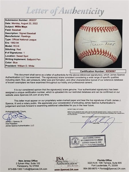 This autographed Official National League baseball has been personally hand-signed by the "Say Hey Kid," Willie Mays of the San Francisco Giants. This autograph is certified by James Spence Authentication...