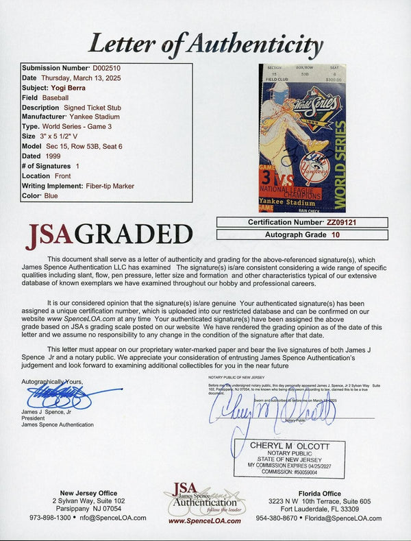 Yogi Berra Signed 1999 World Series Game 3 Ticket Stub -Auto Graded 10 (JSA LOA)