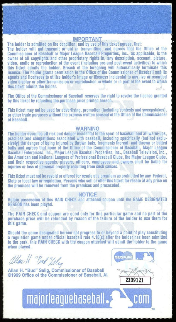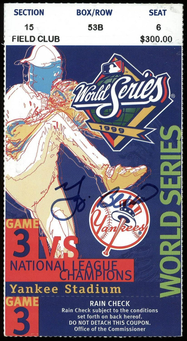 This Original Hand Signed Autographed 1999 World Series, Game 3, New York Yankees vs. Atlanta Braves Ticket Stub has been personally hand-signed by Yogi Berra of the New York Yankees. ...