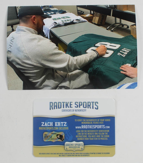 Custom on-field style jersey with everything sewn on, size XL. Has been hand-signed by Zach Ertz.The lot / autograph(s) includes an official exclusive Zach Ertz hologram and COA from Radtke...